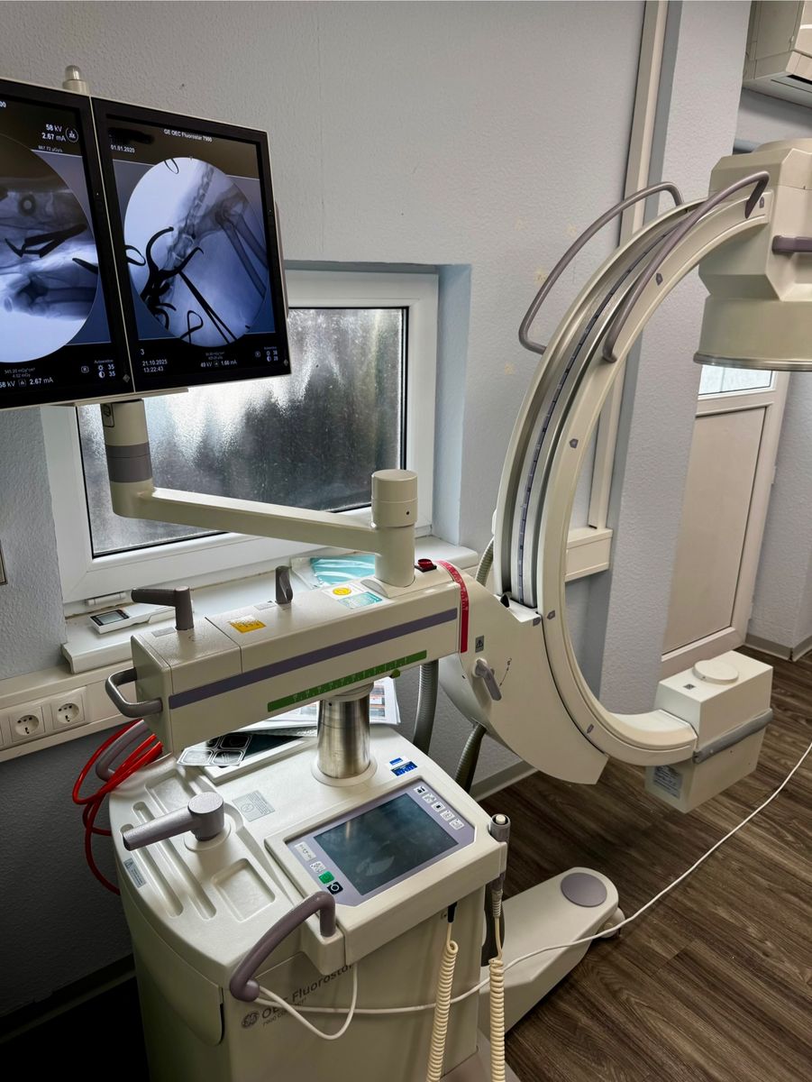 Ein besonderes neues Highlight ist unser C-Bogen, ein mobiles bildgebendes Röntgensystem, das während der Operation Echtzeit-Durchleuchtungen ermöglicht und in diesem OP seinen Platz findet. Dadurch können wir Knochen, Implantate oder Gelenkstrukturen direkt während des Eingriffs beurteilen und beispielsweise Osteosynthese-Material optimal platzieren.